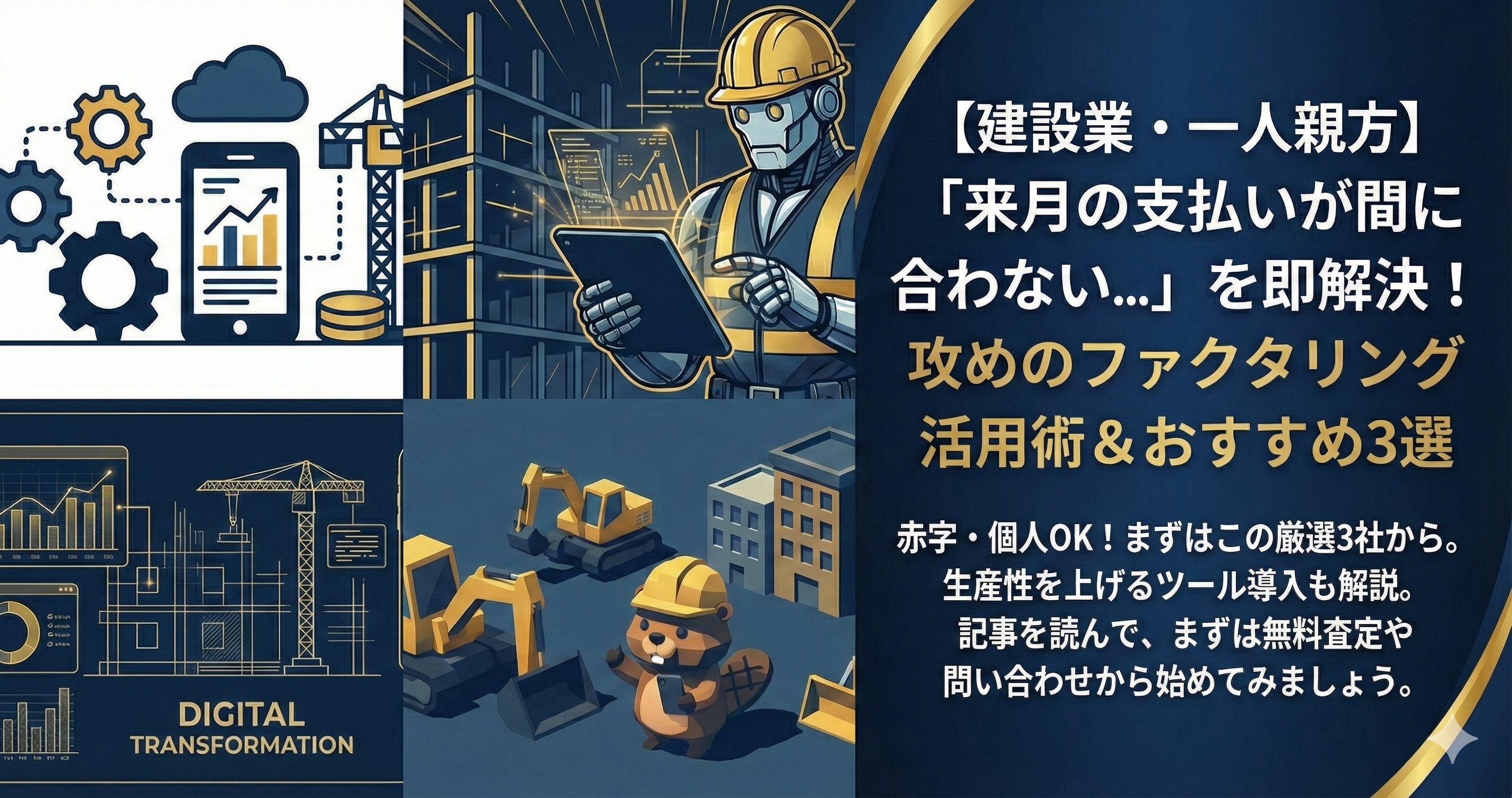 「来月の支払いが間に合わない…」建設業・一人親方の資金不足を即解決!借金せずに現金化できる「ファクタリング」おすすめ3選を紹介。赤字・税金滞納でもOK、最短即日で資金調達が可能。スマホ完結や対面相談など、忙しい現場のための厳選比較です。無料査定で危機を乗り越えましょう。