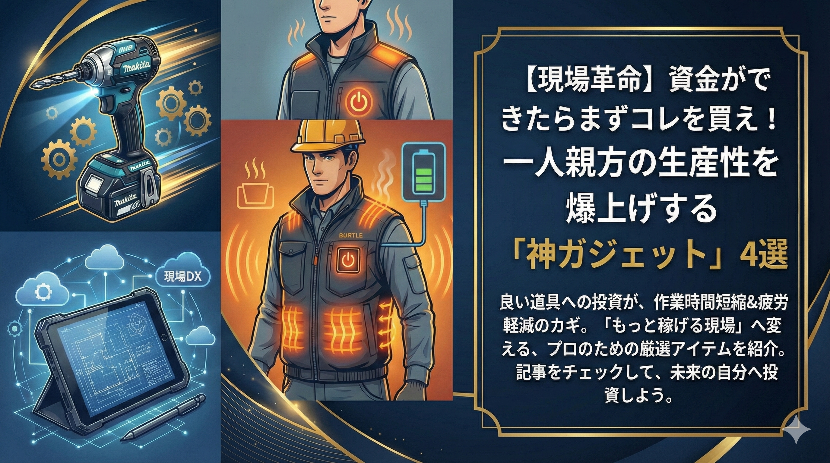 資金繰りが落ち着いた建設業・一人親方へ。現場の生産性を劇的に上げる「神ガジェット」を厳選紹介。コスパ最強のハイコーキ最新インパクト、バートル電熱ベスト、図面管理iPadなど、使うだけで元が取れるプロの道具への投資で、毎日の作業を楽にしませんか?